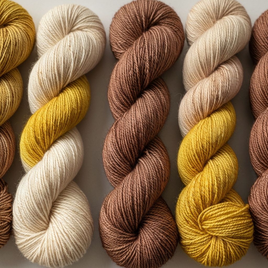 Earth-toned skeins colored with plant-based, sustainable dye processes.
